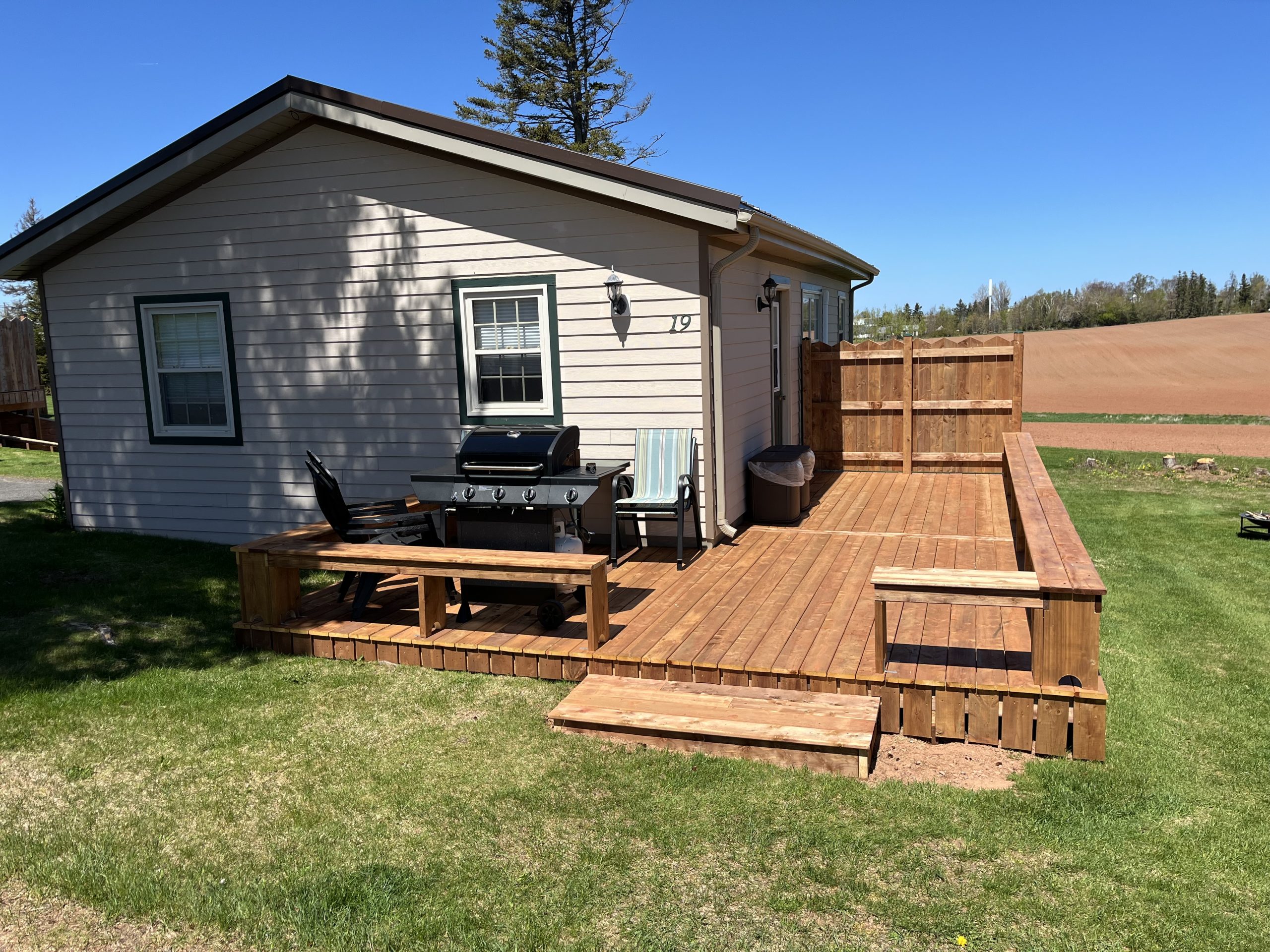 The cottage boasts a fully equipped kitchen with a dishwasher, a comfortable living room with an electric fireplace, a second flat-screen TV and DVD player, and a second private deck with outdoor furniture and a propane barbecue—ideal for alfresco dining.